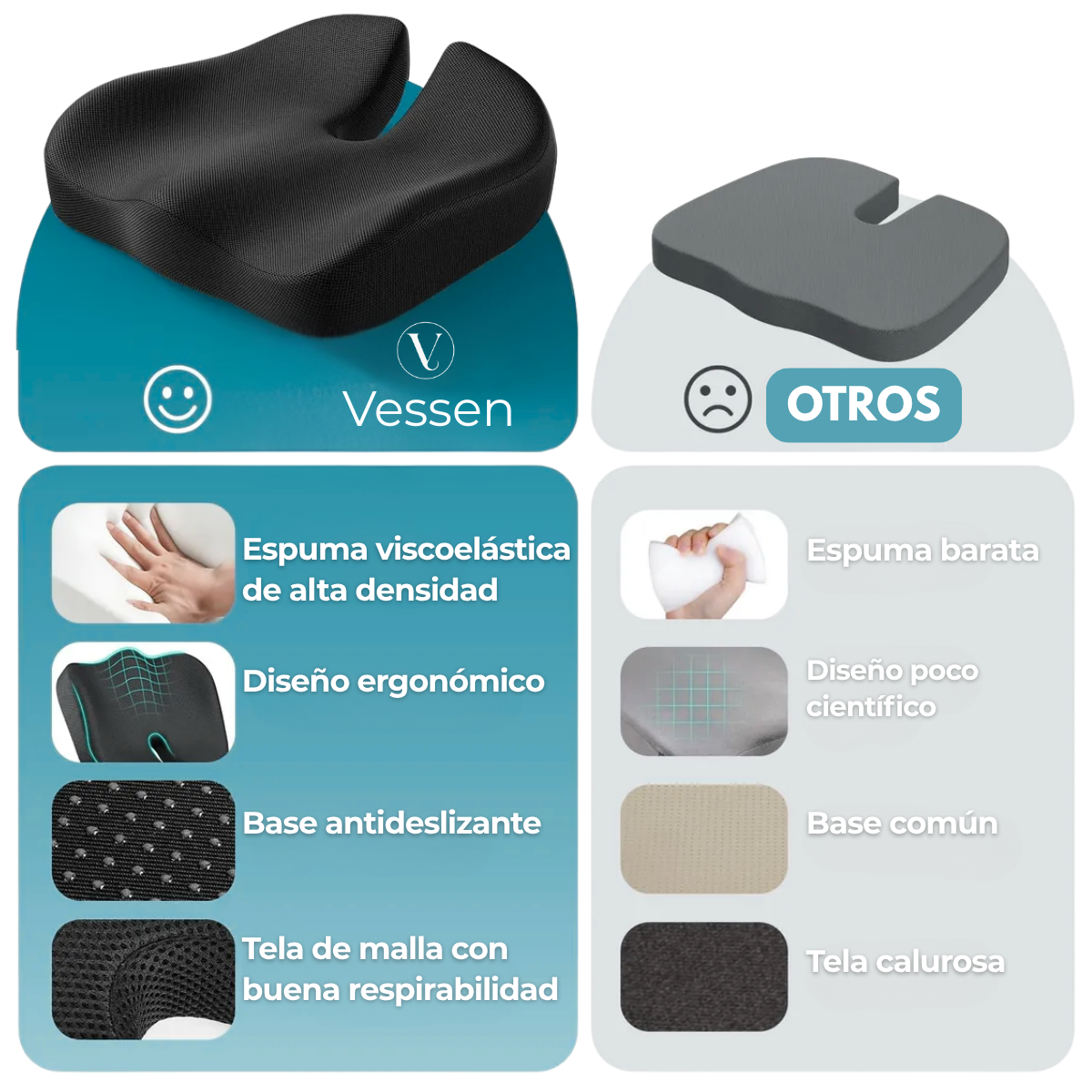 Kinesiólogos y especialistas en ergonomía recomiendan Vessen por su descarga de presión en coxis, soporte memory foam denso y base antideslizante que estabiliza la postura.